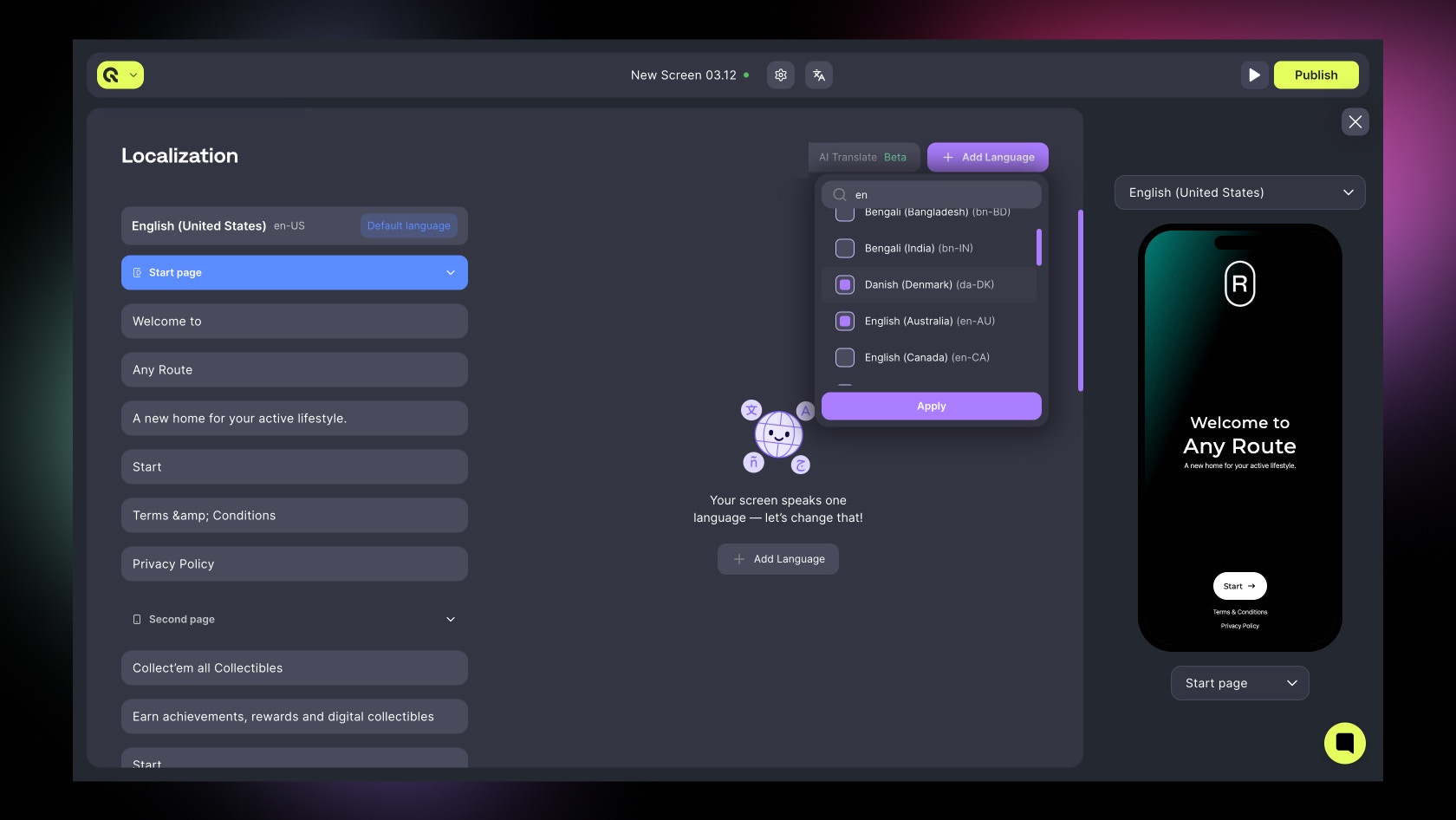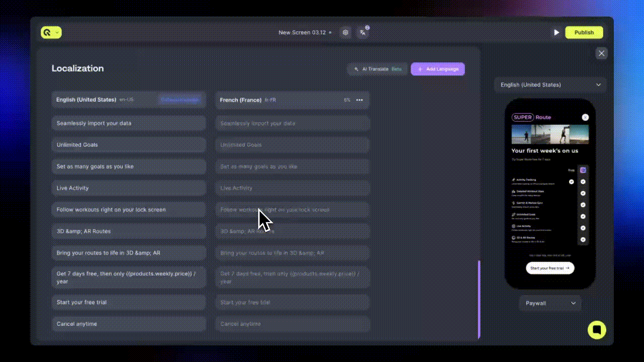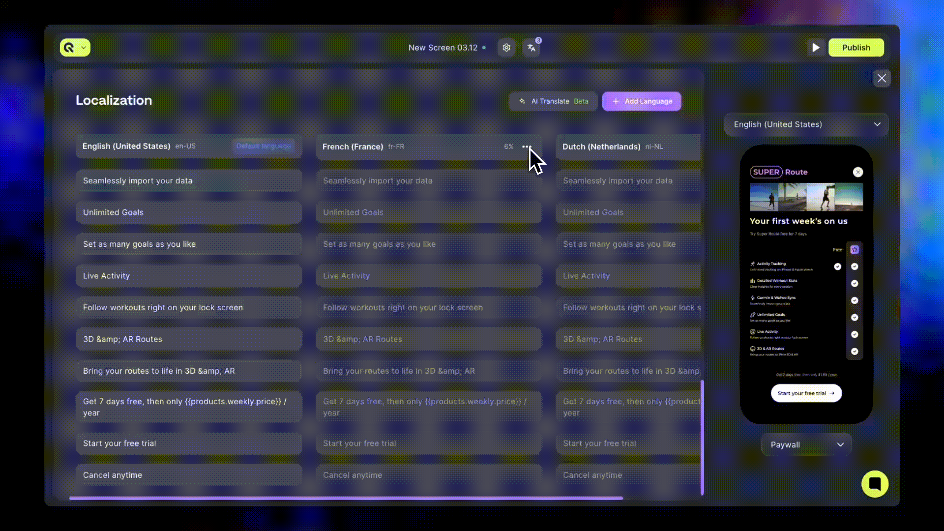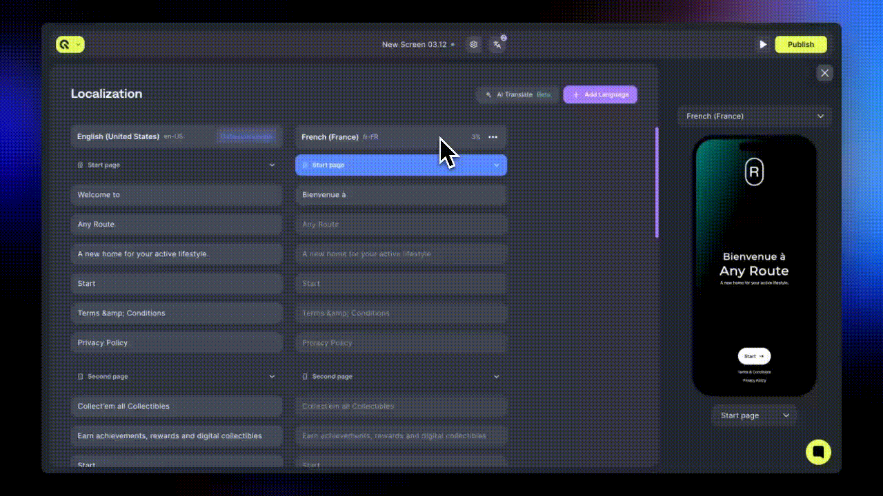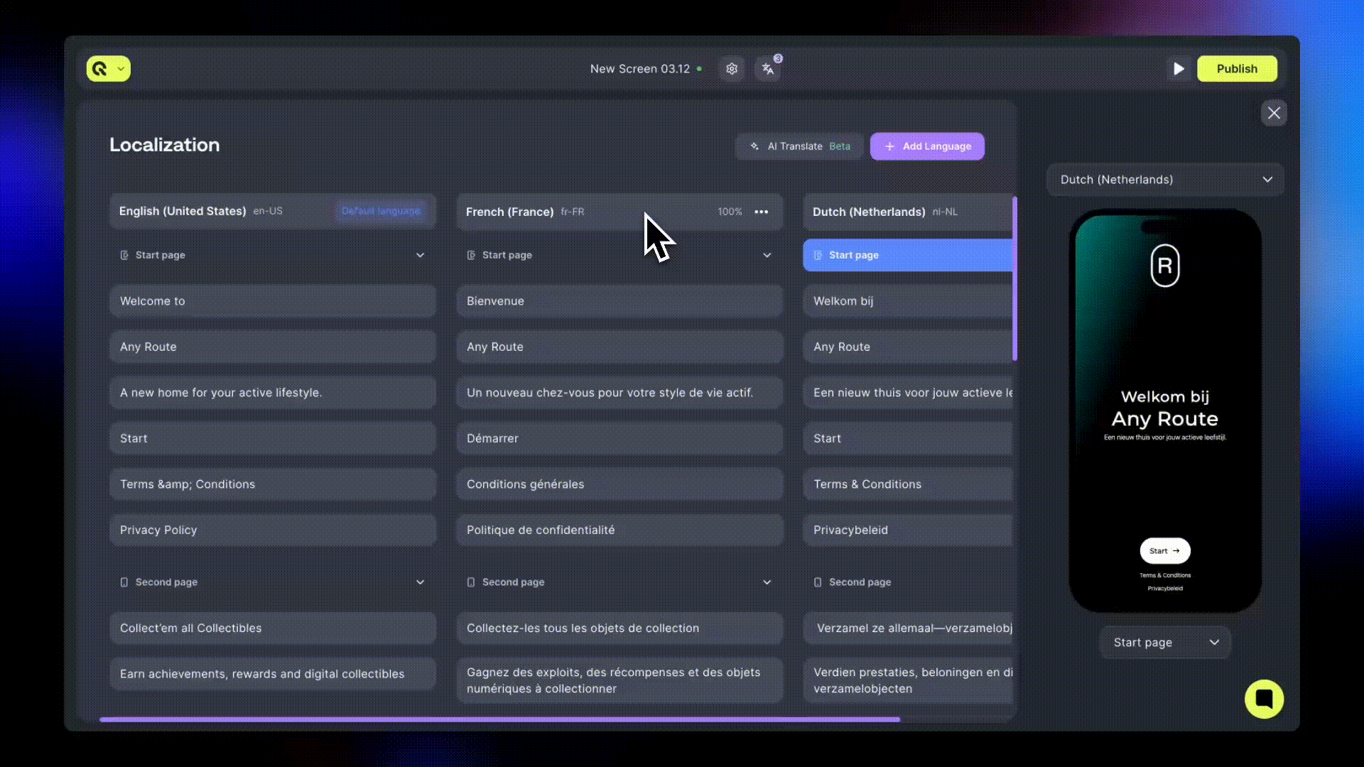 - Keep all languages close to 100% completion before publishing screens.