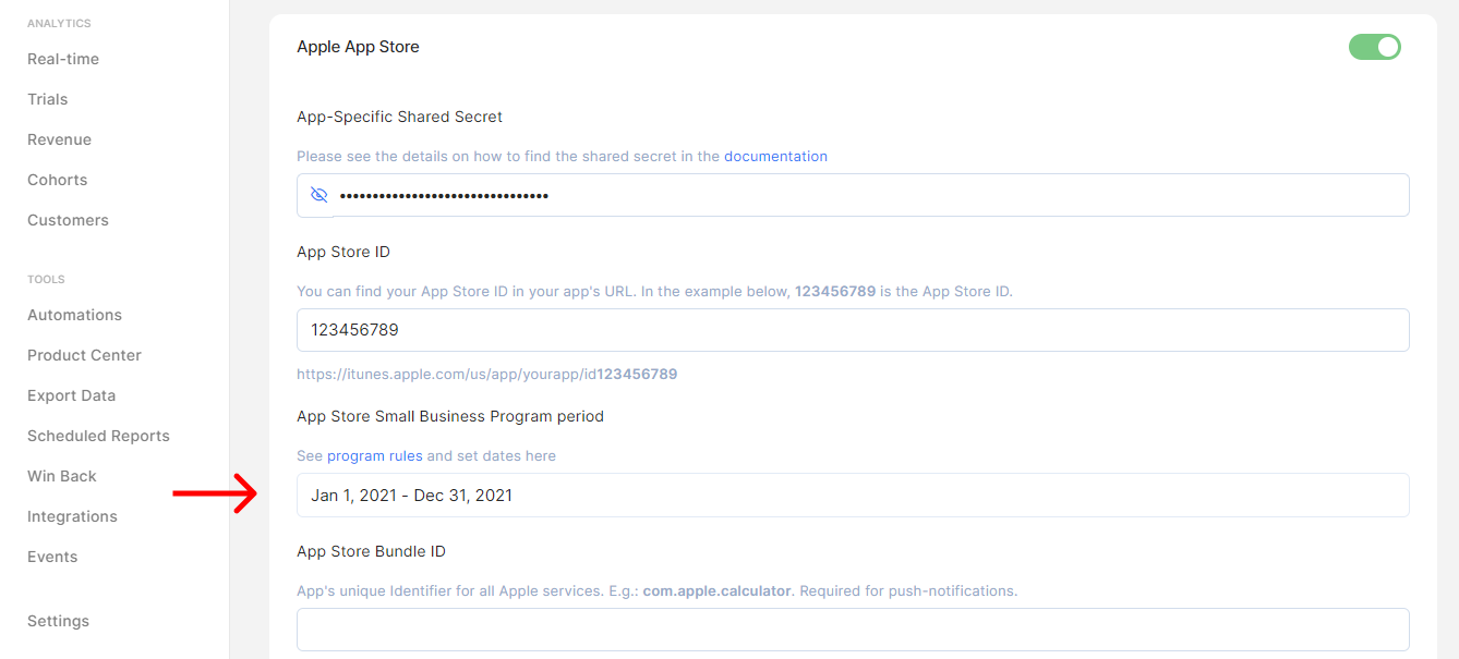 You have to set the dates for your participation in the Small Business Program for each project you have with Qonversion. So if you have a number of apps don’t forget to provide the details for each of them.