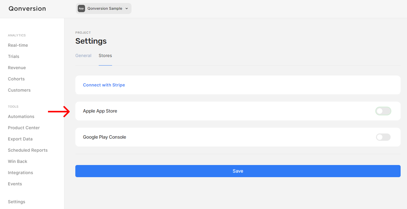 Qonversion can accurately calculate your app’s proceeds after excluding Apple’s commission taking into account your participation in the Small Business Program. You can choose to send the proceeds to any integration you use.Navigate to your project settings dashboard in Qonversion