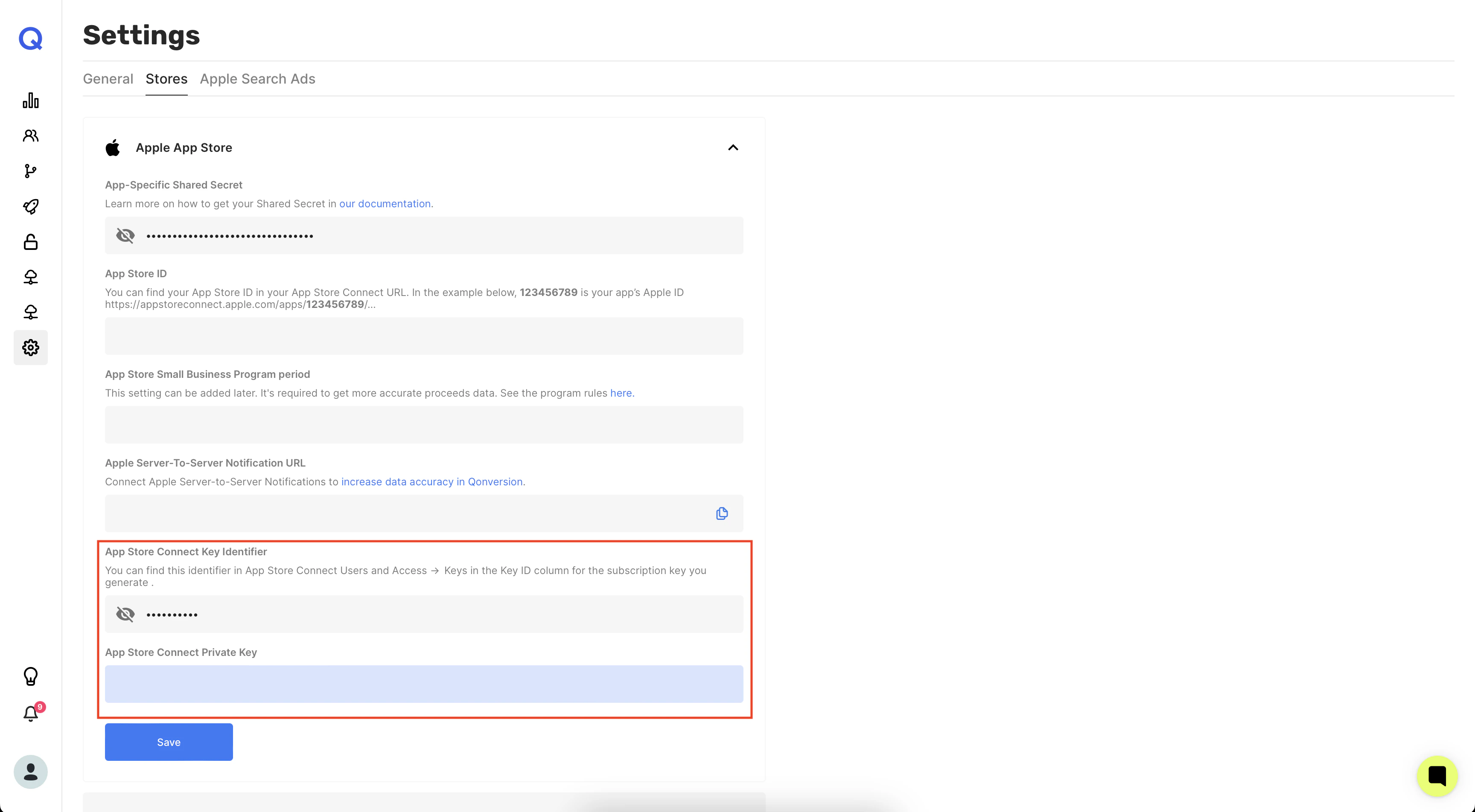 Next, you need to generate a Private Key and download its private part. See details in the documentation. After downloading the file, paste it into the App Store Connect Private Key field and the key identifier in the App Store Connect Key Identifier field.