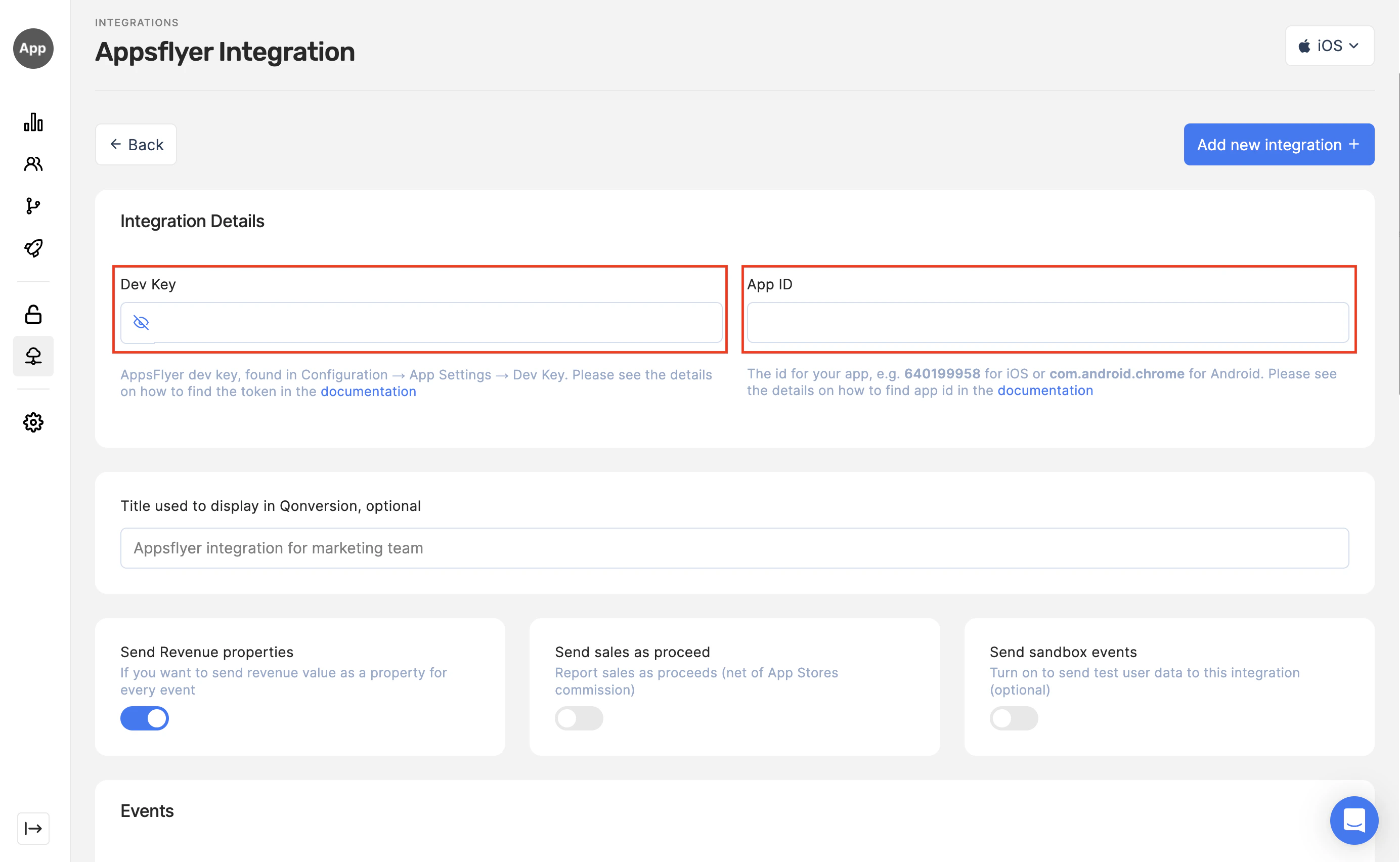 Navigate to the Integrations section in your Qonversion project, select AppsFlyer, and provide the Dev Key and App ID, and Save