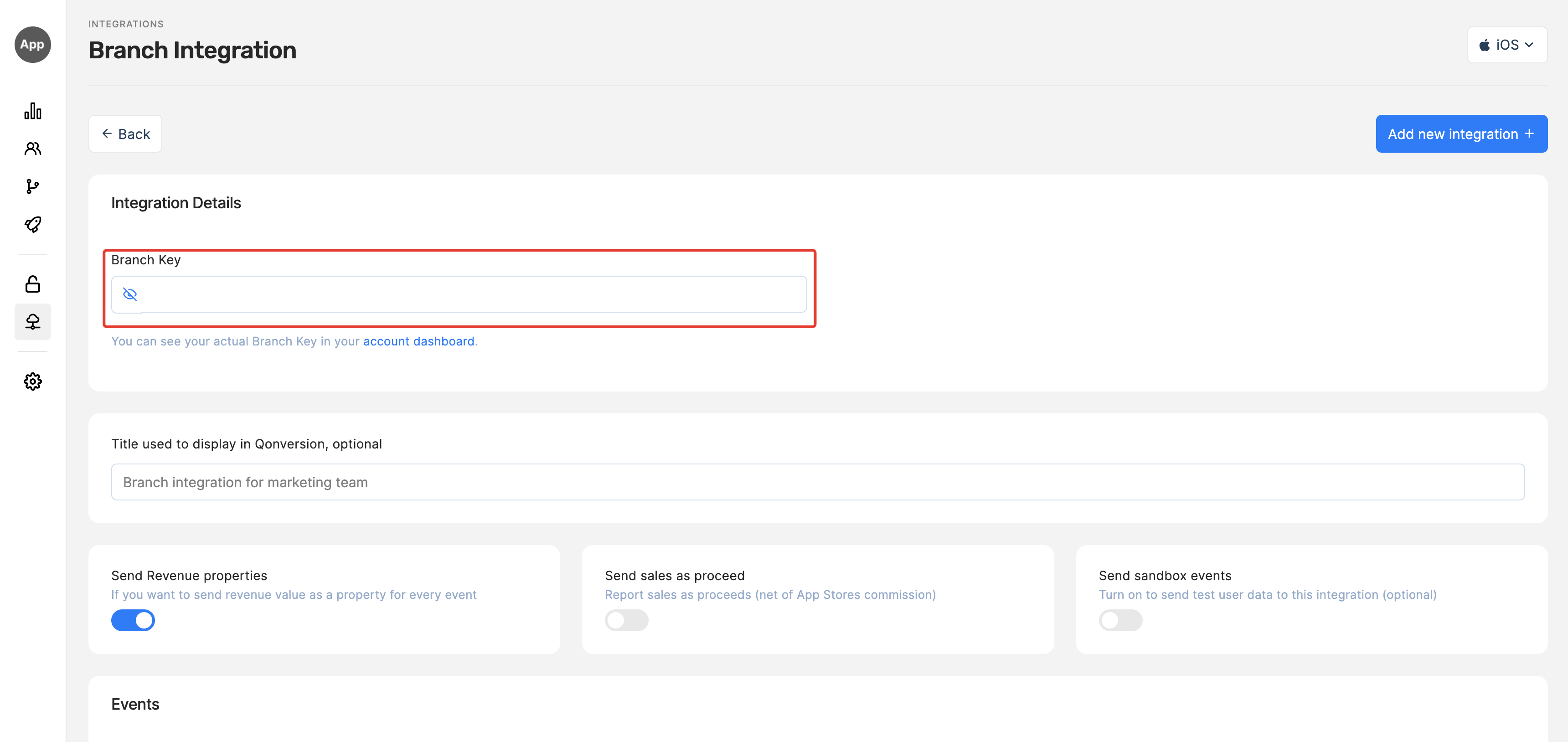 - Navigate to the Integrations section in your Qonversion project, select Branch, and provide the Branch Key and Save.