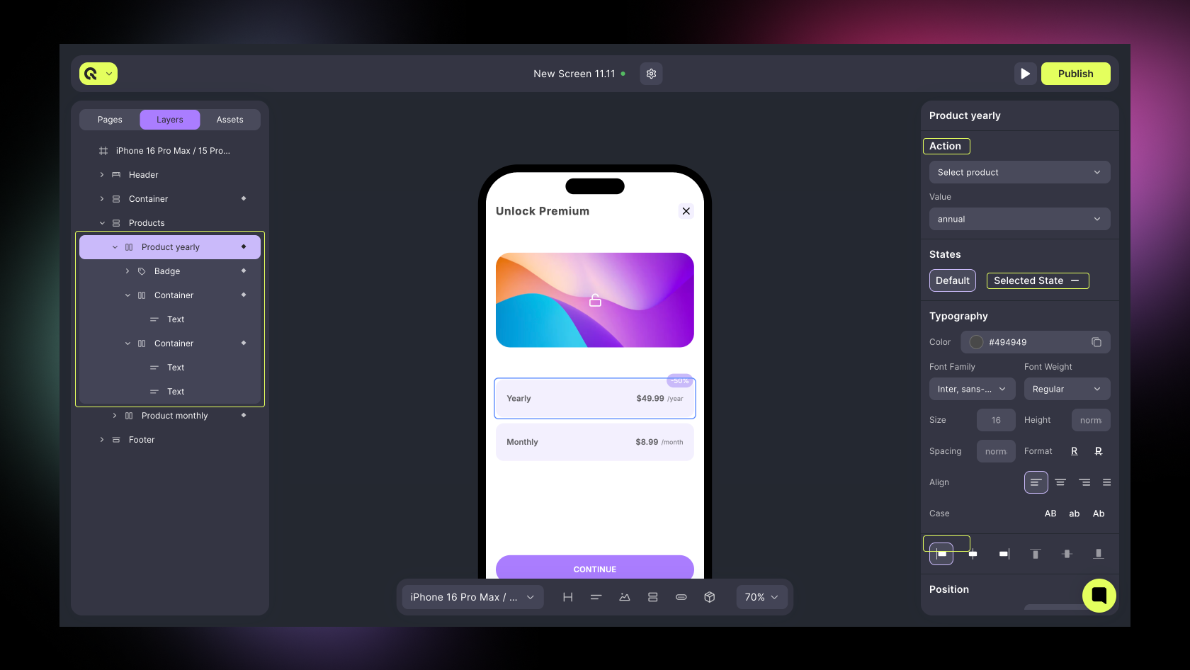 Prebuilt components are ready-to-use component templates designed to accelerate paywall creation. Instead of assembling individual elements, you can drop in a complete, styled product block and customize it to match your brand.Each template comes with: