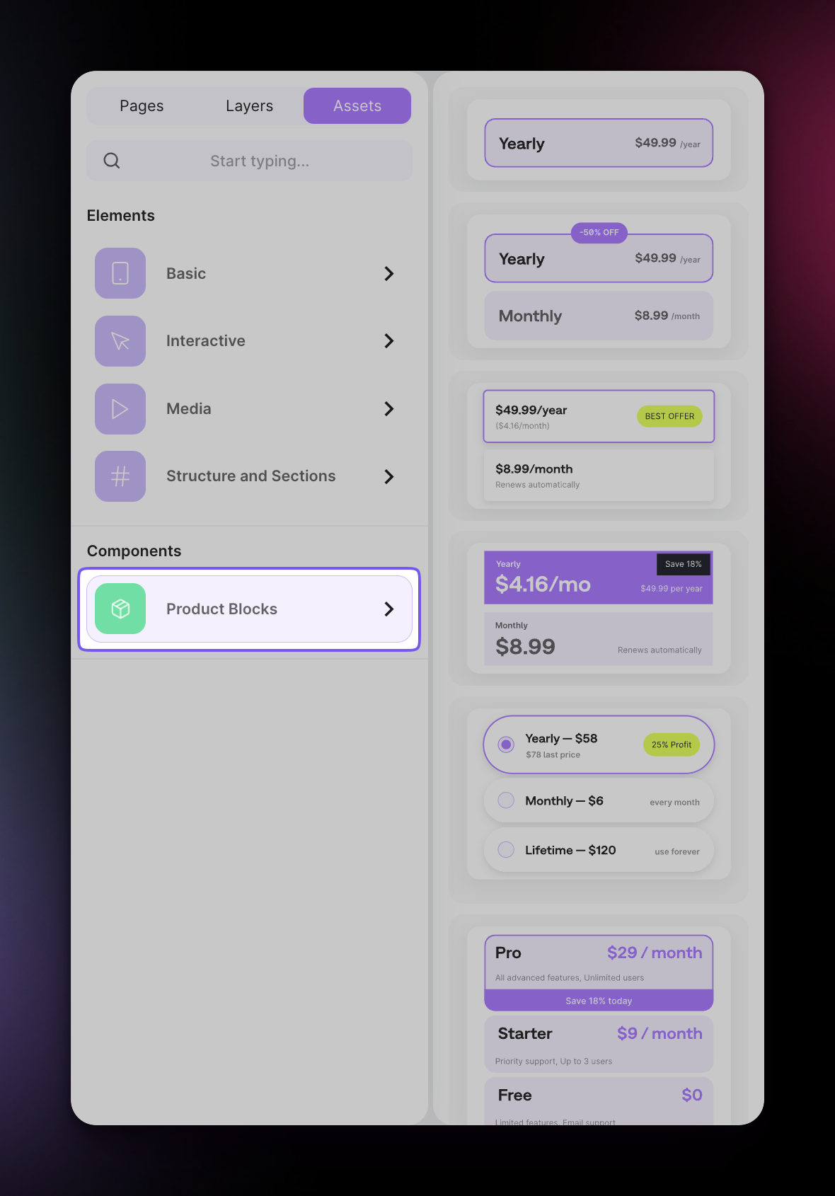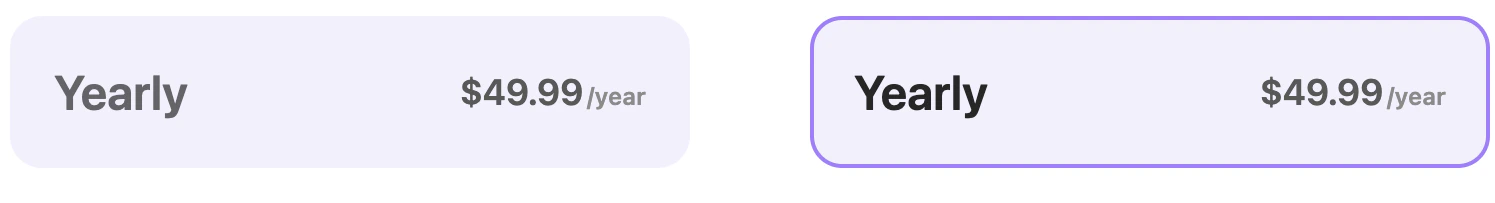 | Toggle | ❌ | ✅ | Switch element for selecting between two states (e.g., Monthly vs. Yearly) | Changes product selection |