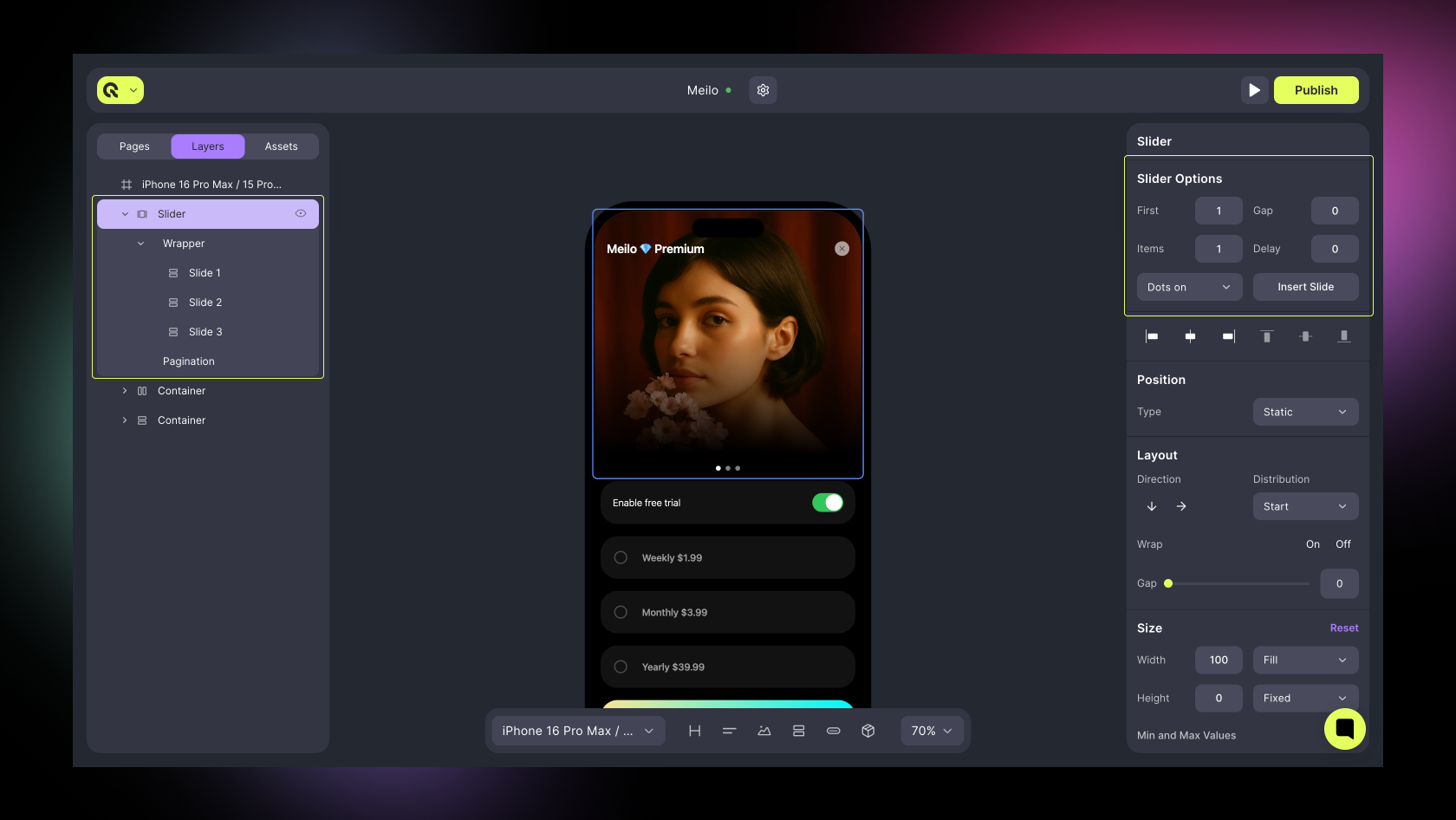 A single page inside a Slider. Each slide has independent content and styling. Use for:- Onboarding step