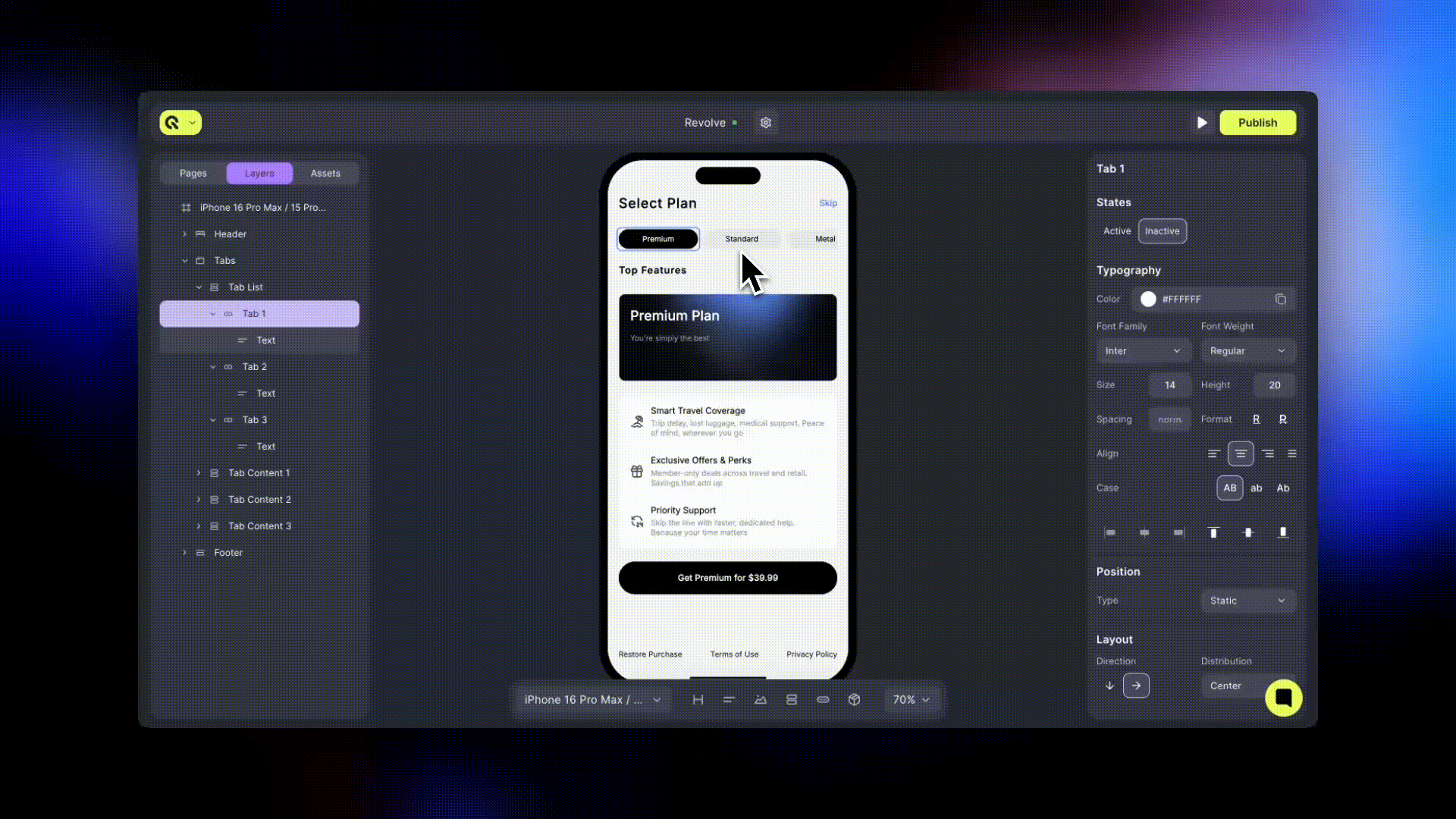 - Preview on multiple devices — use the device selector to check iOS, Android, and tablet layouts