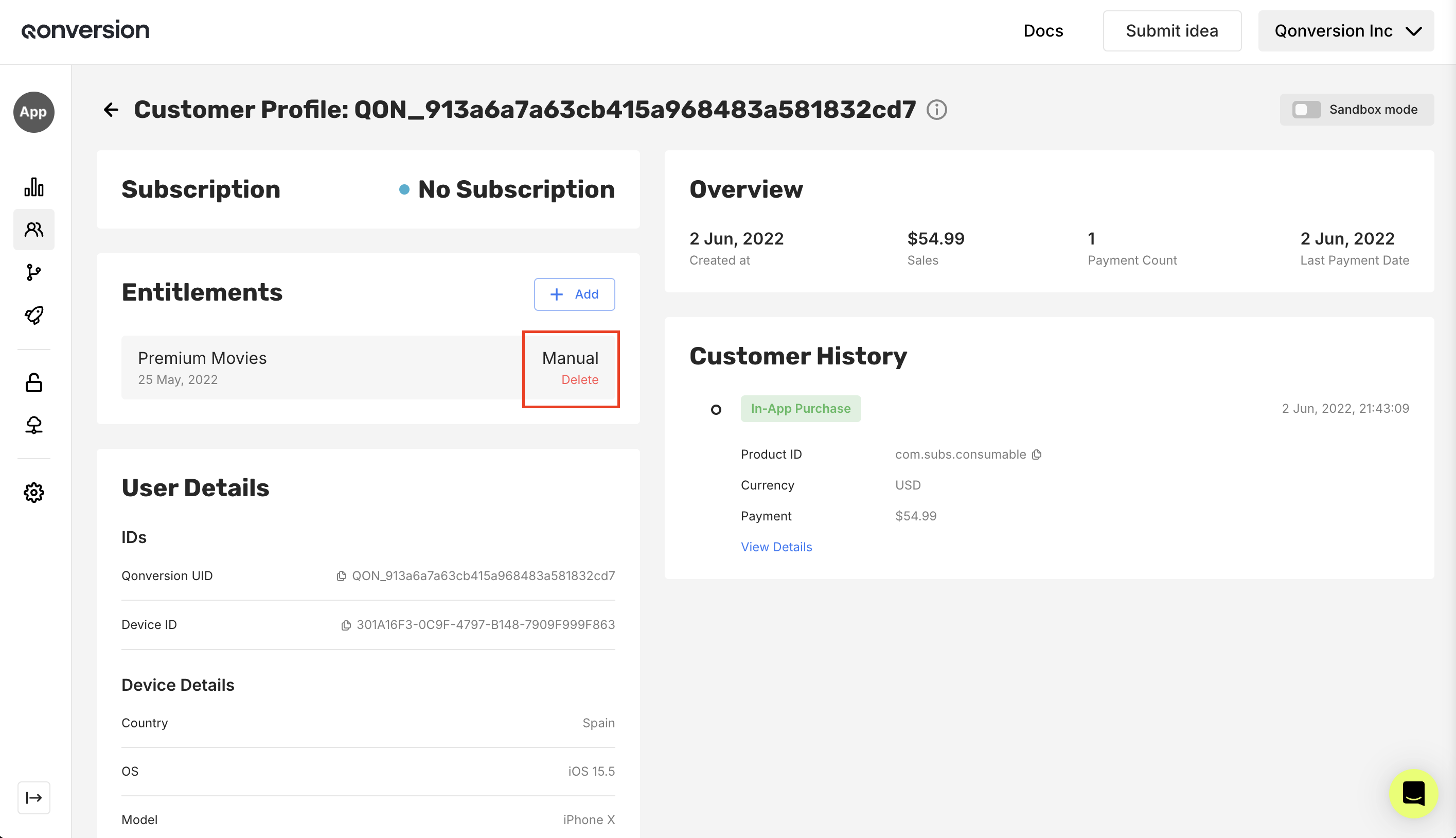 With the “Edit entitlements” button in Qonversion, you can grant users access to premium content for a specified duration without requiring a purchase or promo code. This feature proves valuable in many scenarios, such as offering beta users a free preview of content or effectively addressing customer support concerns.- Navigate to the Customers tab
