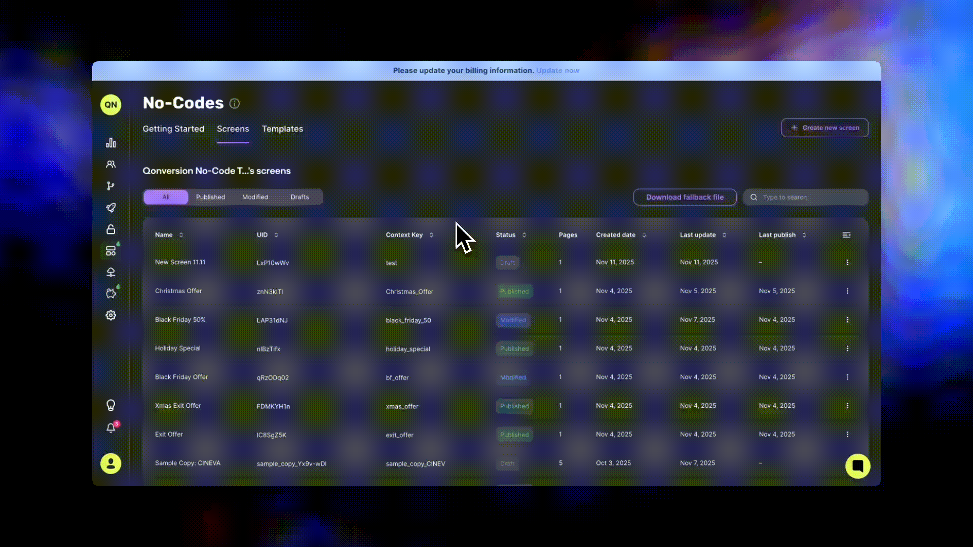 When you publish a screen, Qonversion automatically allows you to generate a fallback file for it. This file contains all visual elements and logic needed to display the screen offline. The system then behaves intelligently:- Smart Detection – Automatically detects when a network or server error occurs.