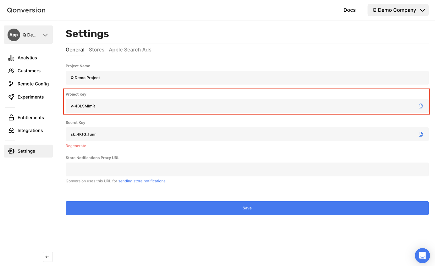 - Get your Qonversion project key. You can find your Qonversion project key in the Settings section of Qonversion. You will need this key to configure the SDKs.