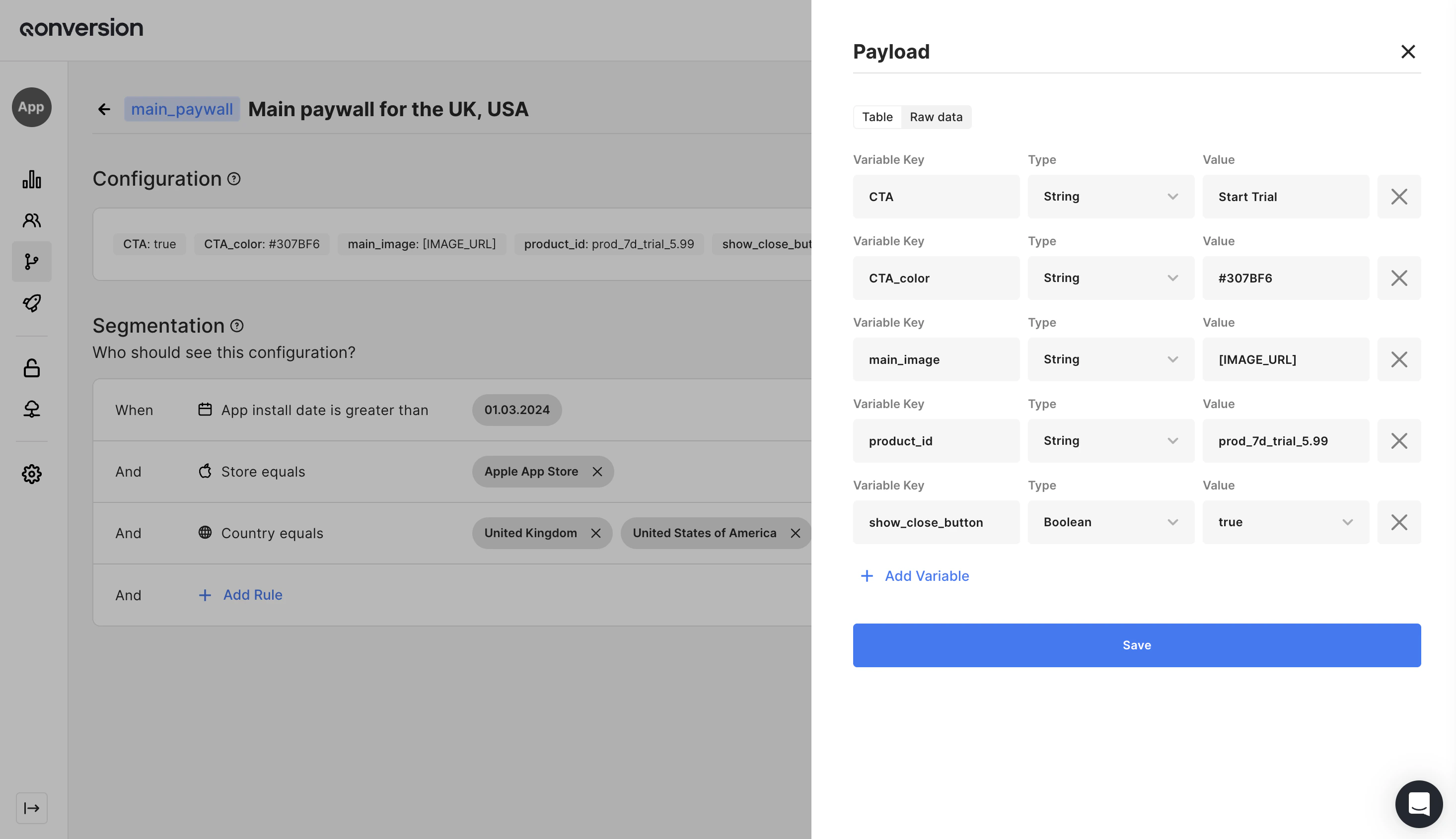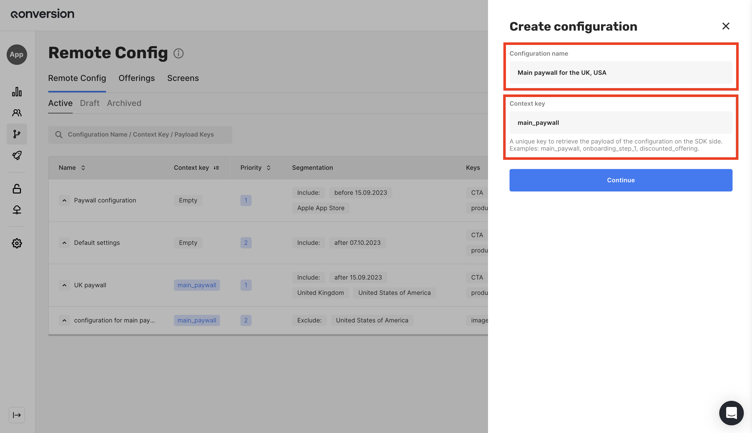 As a first step, name your remote configuration and select a context (part of your application) you’d like to manage remotely. Examples of app contexts you may configure with us:- main_paywall: to set up settings for different user segments for your main paywall.