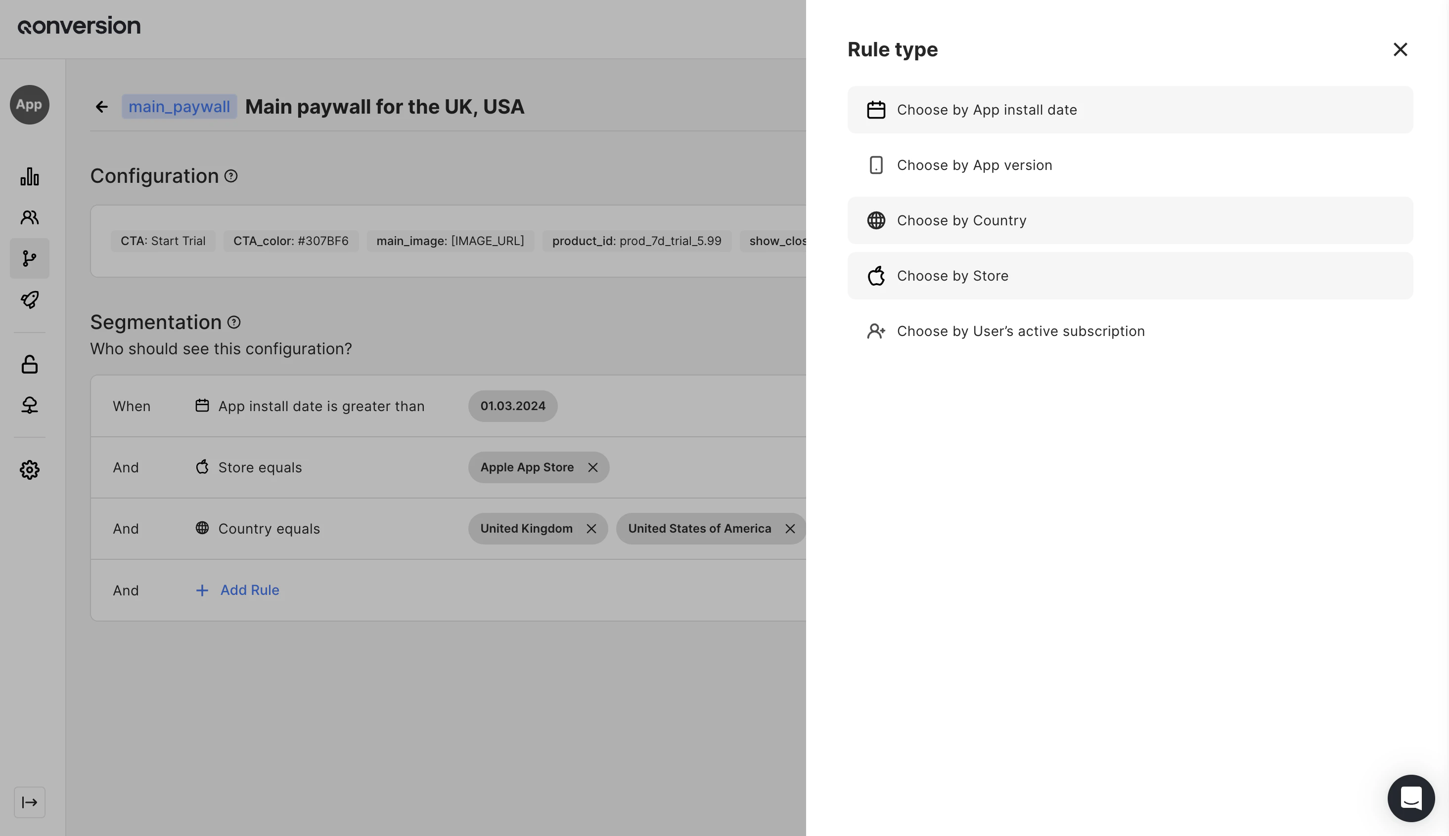 Qonversion Remote Config has flexible options to target a desired user segment. Segment users by:- App install date