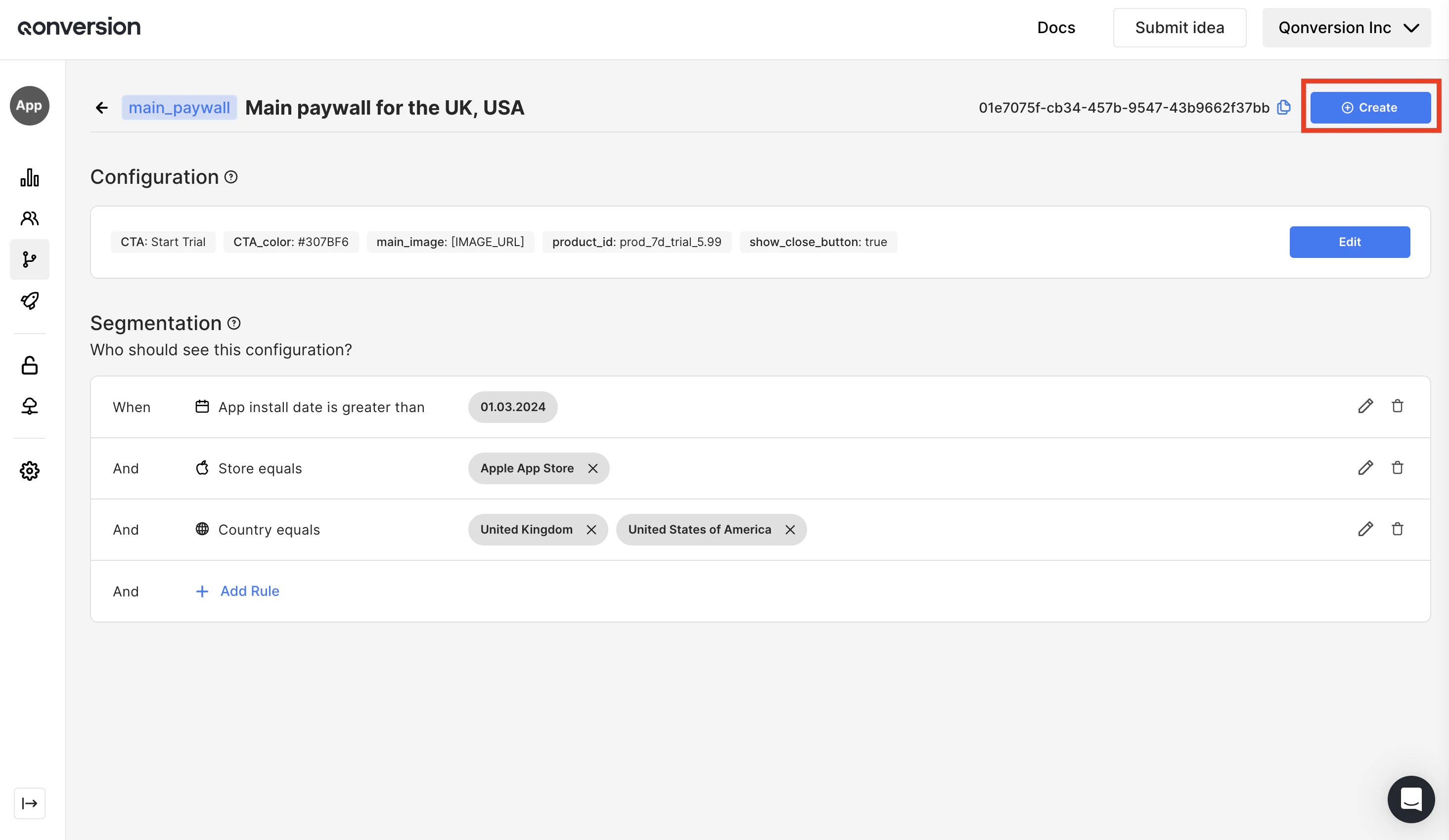 Once you have added all the necessary properties to your in-app configuration, validated changes in your app, and assigned desired segmentation rules, the only thing left is to click the Create button to move the configuration from Draft to Active state.