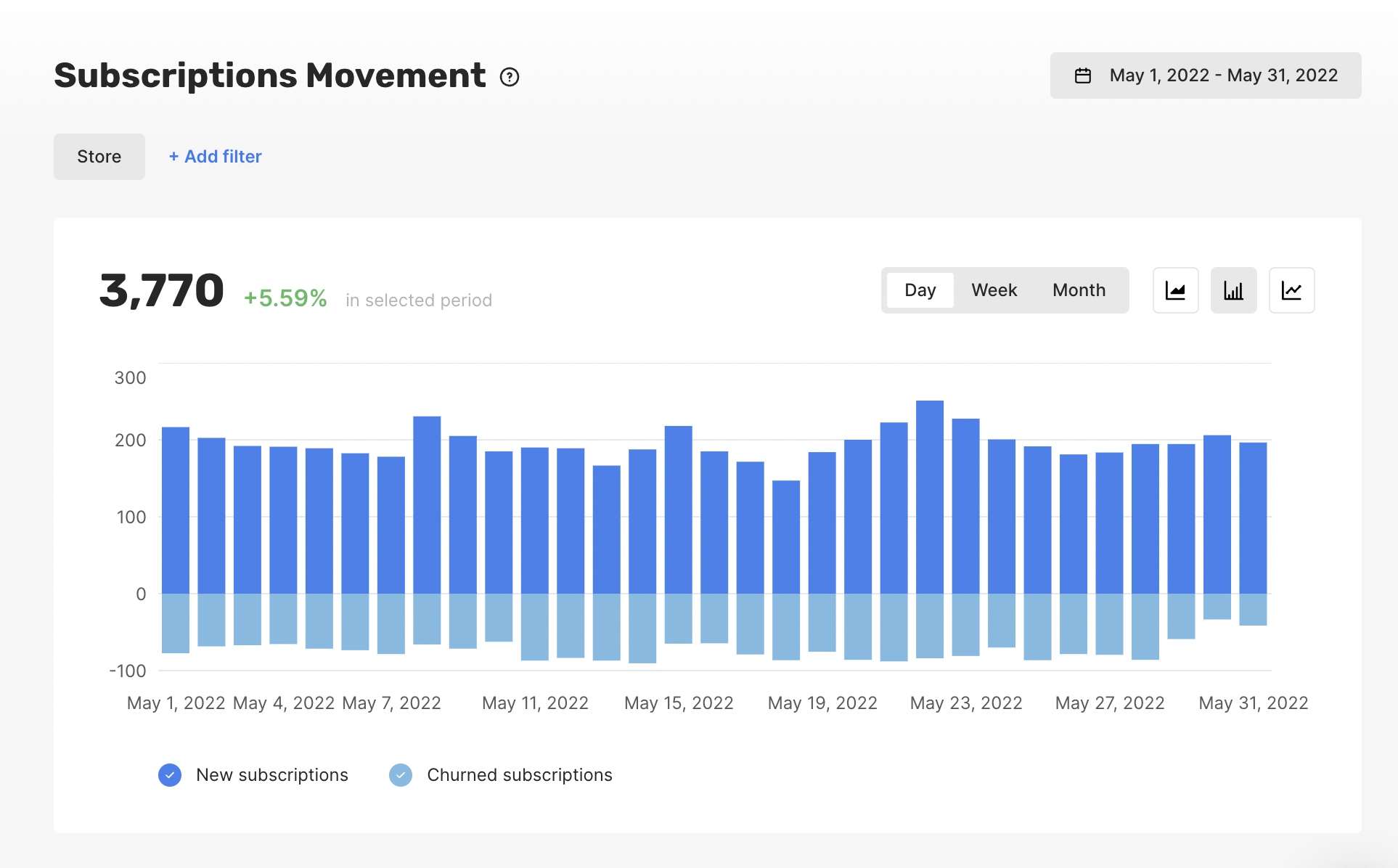Subscriptions Movement helps you understand how your subscriber base changes over time. This chart shows new paid subscriptions (above zero), and subscriptions churned (below zero), i.e., expired or refunded subscriptions. Please note that the subscription cancellation, i.e., turning off auto-renewal, does not mean the subscription has churned. Such subscriptions show up as churned in this chart only once they expire. Additionally, if a user did not cancel a subscription, but a platform (Apple/Google) can not renew a subscription due to lack of funds or incorrect payment details provided by a user, this subscription expires after being in a billing issue state for some time. A refund requested by a user immediately leads to subscription expiration. The chart’s title shows the net number of new paid subscriptions during the selected period; the percentage shows how this value changed compared to the previous period of the same length. In the example below, the subscription base increased by 3,770 active paid subscriptions, which is 5.59% higher than your growth in the previous period of the same length (31 days).