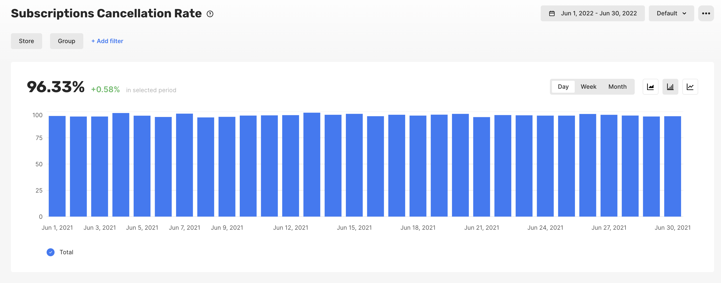 The subscription cancellation rate is calculated as the ratio of: → Numerator: subscription cancelled events attributed to subscription start date → Denominator: subscriptions started events for the selected period