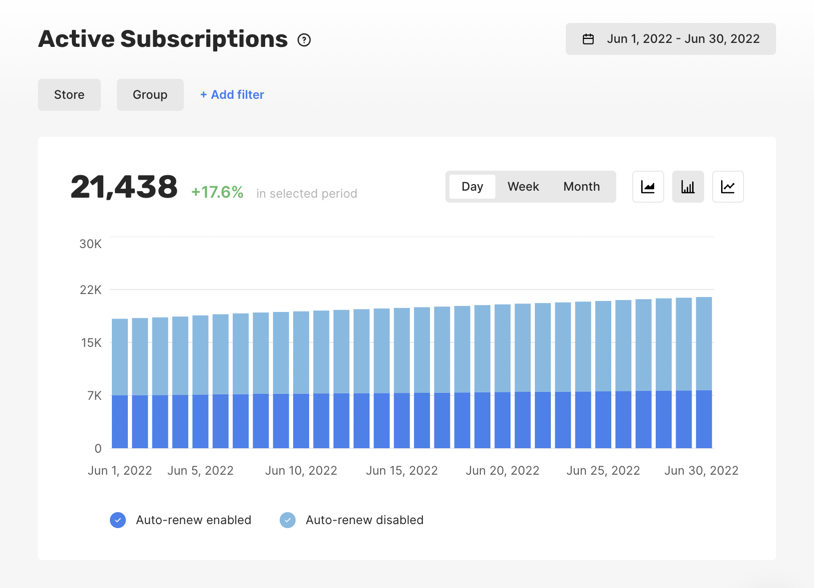 The Active Subscriptions chart shows the number of active paid subscriptions at the selected dates. This chart includes only paid subscriptions, i.e. it does not include free trials. The Active Subscriptions chart shows the subscriptions split by their auto-renewable state. When a user cancels an auto-renewable subscription on the app store, it is still active till the expiration date. The chart’s title shows your active subscriptions at the end of the selected period, and the percentage reflects the change in subscriptions during the period chosen. In the example below, for the 30th of June, you have 21,438 active paid subscriptions, which is 17.6% higher than you had for the 1st of June.