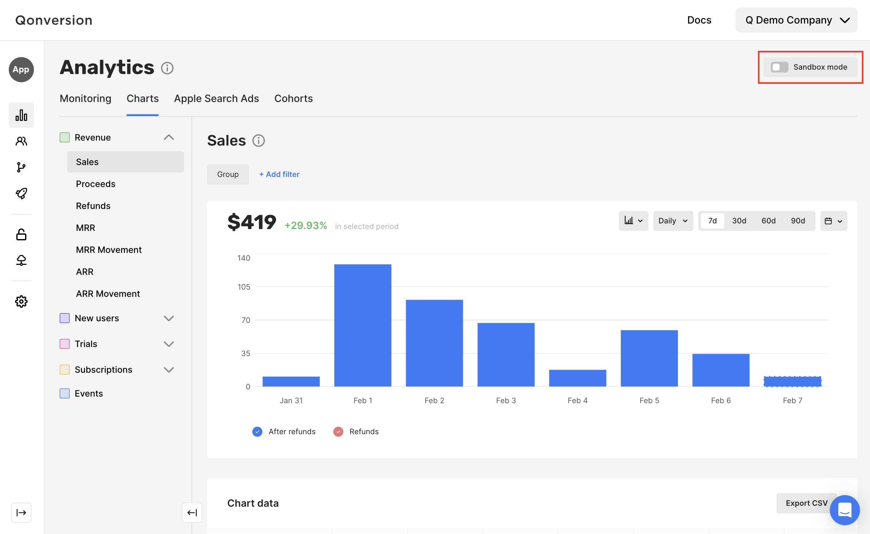 You can see the test data in Qonversion by switching the Sandbox mode toggle on the right side at the top in Qonversion Dashboard . While using this mode, you will see the Test Mode label at the top of all the dashboards. Remember to switch it off when you have finished testing.