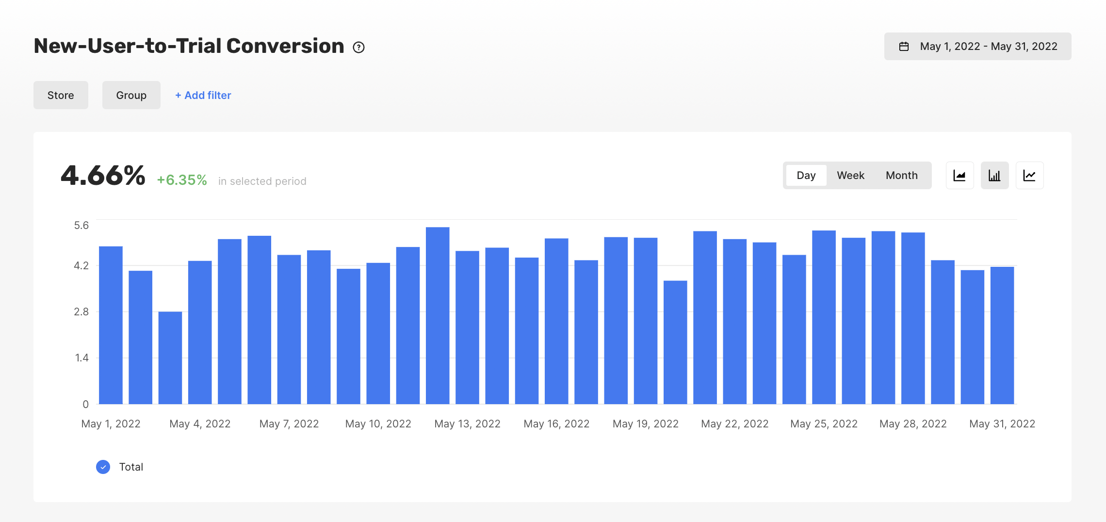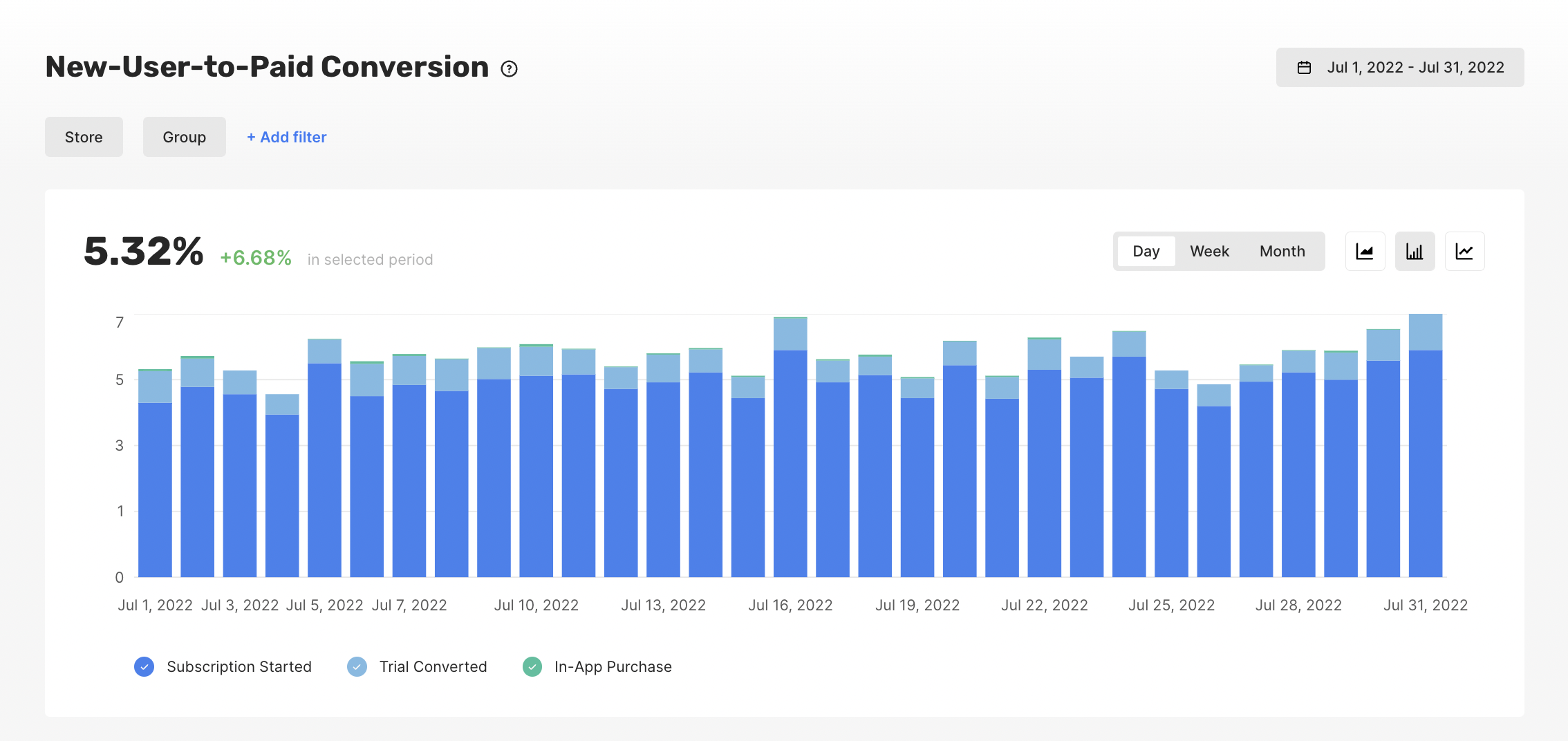 This chart shows what percentage of all new users are converting to paying customers, including the conversion split by type of initial purchase:- Trial converted (the user initially started a trial, and that trial successfully converted)